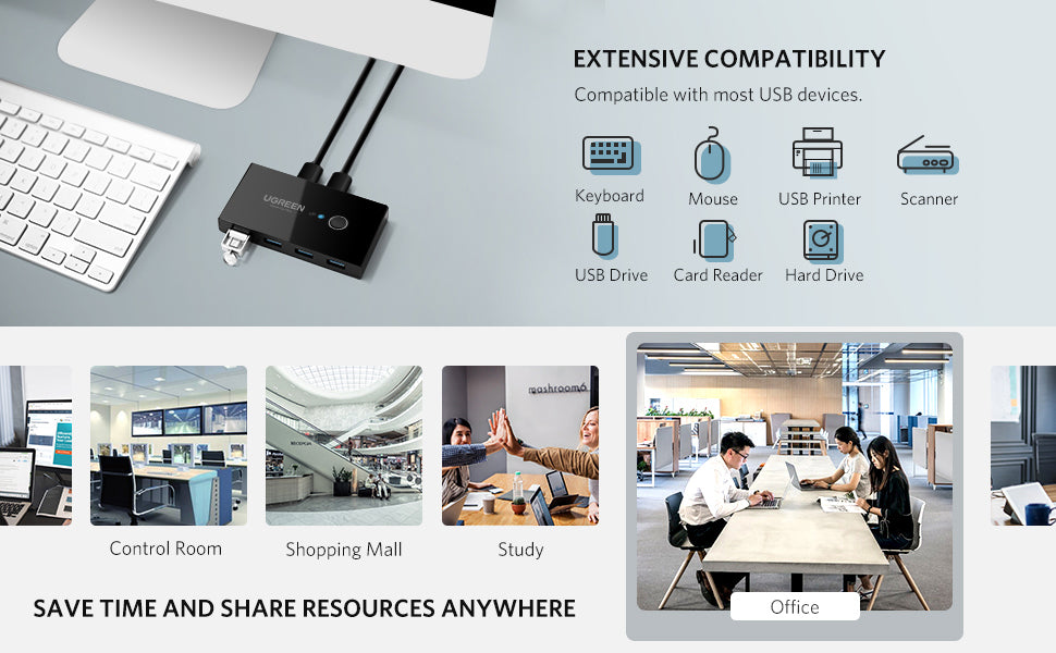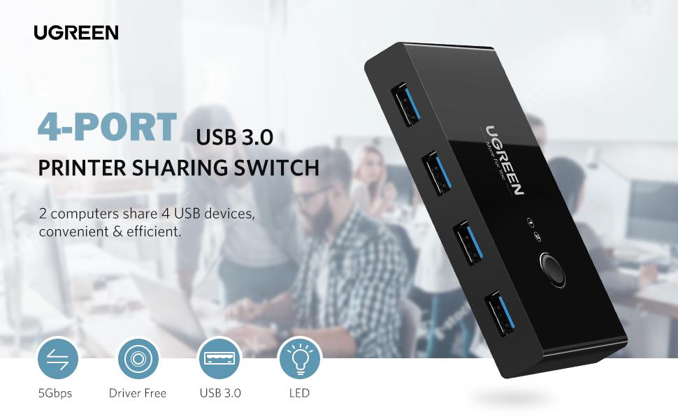 UgreenUSB 3.0 Switch 2-to-4 is an excellent choice to share 4 USB devices between 2 systems. It's ideal for sharing a printer or scanner in a small office environment. It's also great for use at home if you have multiple PCs or Macs.